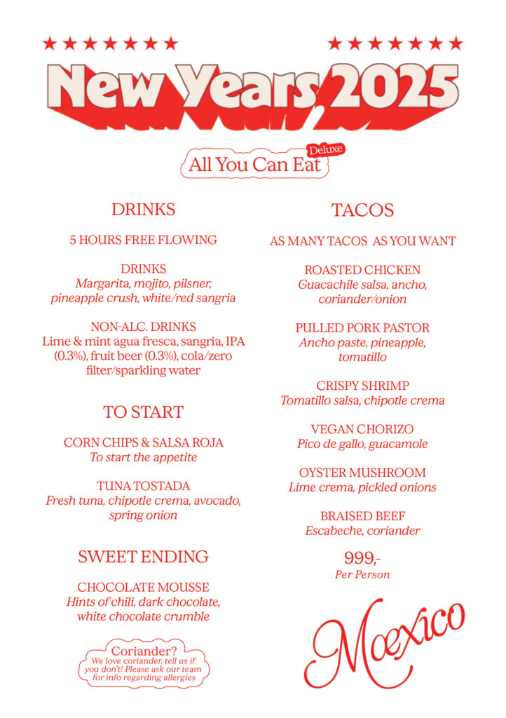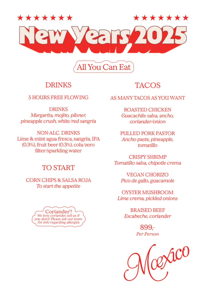 We’ve got everything covered: food, drinks, and the best vibes in town. All you need to do is show up and join the fiesta! Welcome the new year with open arms, endless tacos, flowing margaritas, and maybe a cheeky tequila (or two).